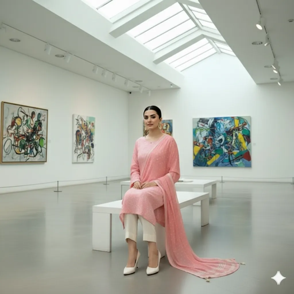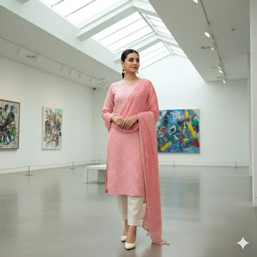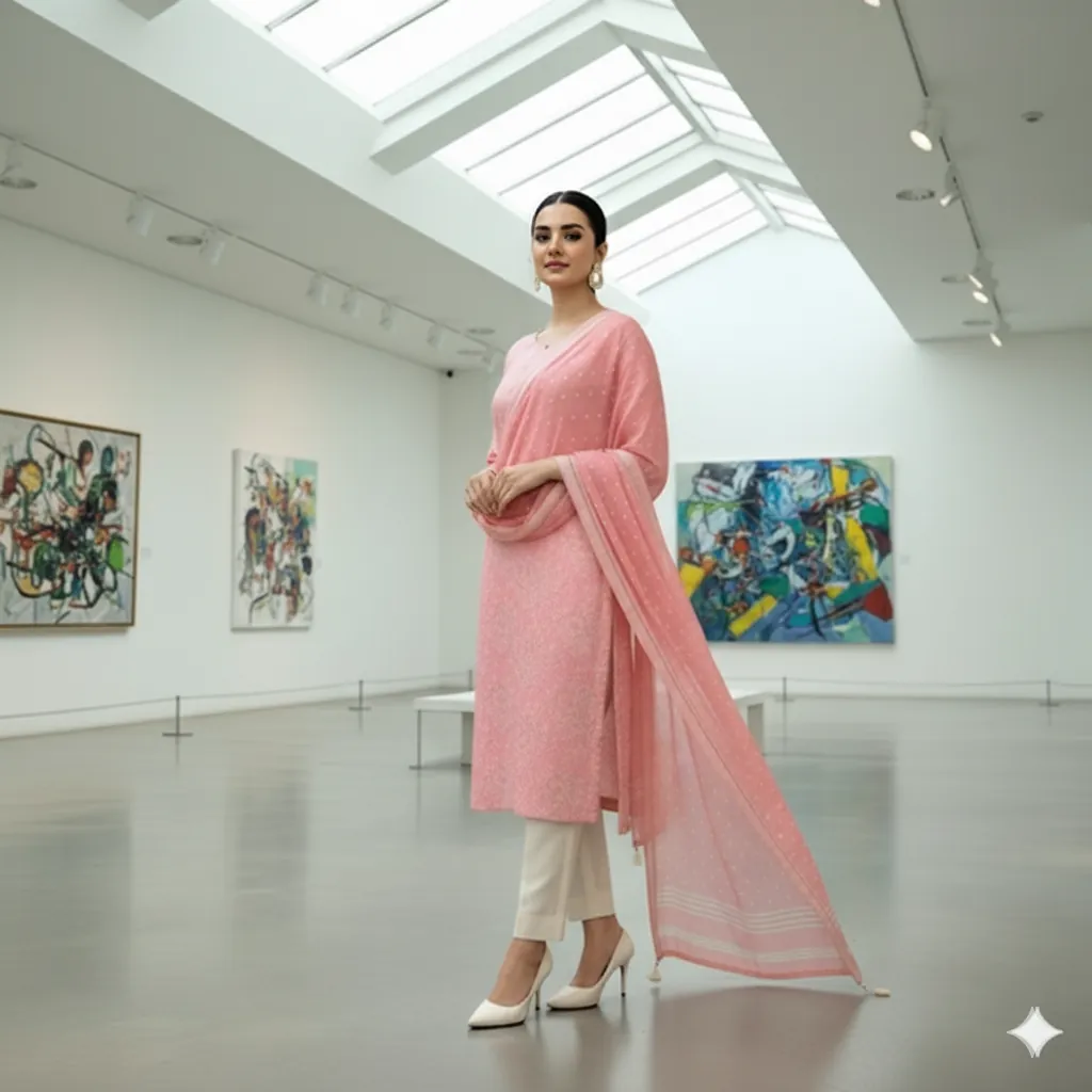 Zeen by Arfat Fabrics 3-Piece Peach & Off-White Polka Dot Lawn Suit - Textured Dupatta | Summer Collection. Step into the season with the gentle elegance of the Zeen by Arfat Fabrics Summer Collection. This 3-piece unstitched lawn suit is a perfect addition to your casual wardrobe. The shirt is crafted from world-class quality lawn fabric and features a playful polka dot print on a soft peach-pink base. The matching dupatta, also in a peach shade, has a subtle self-textured floral or jacquard pattern, adding a touch of sophistication. The ensemble is completed with a solid, off-white trouser fabric, creating a beautiful and balanced look. This authentic product is stamped with the "Zeen by Arfat Fabrics" logo, guaranteeing its originality and superior quality.