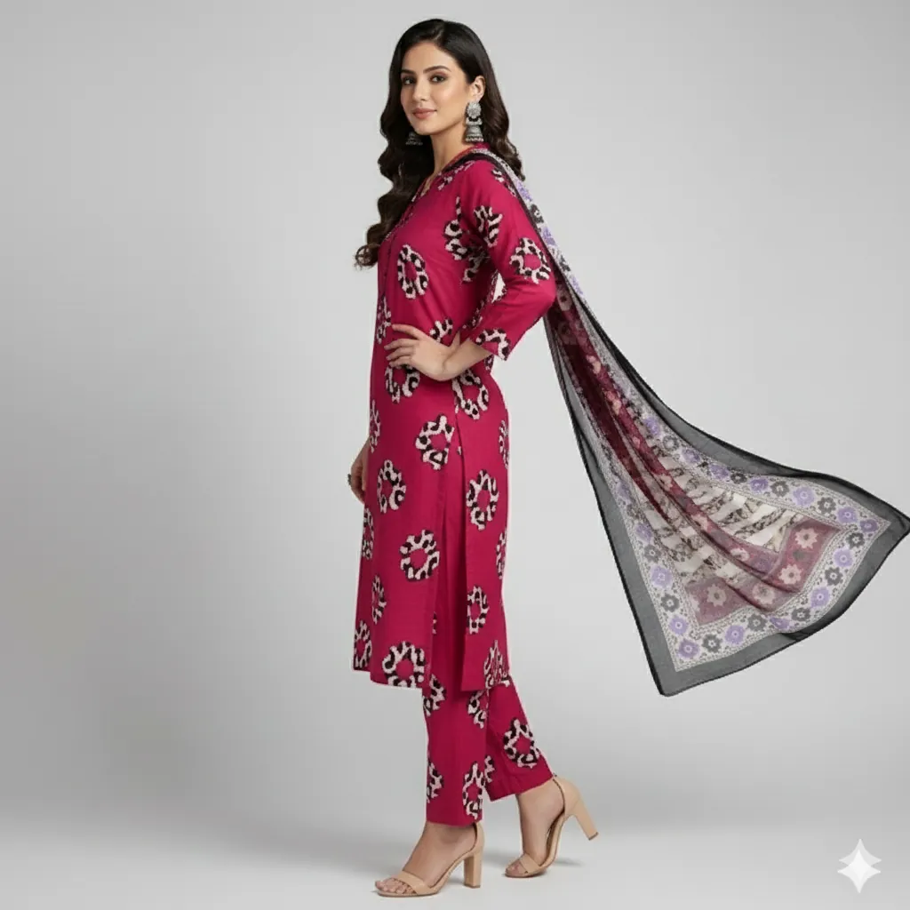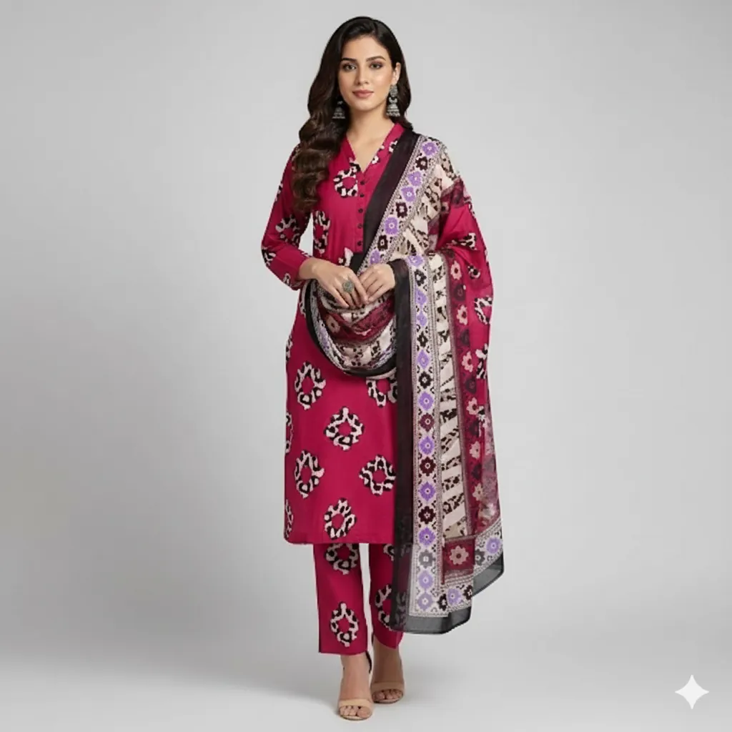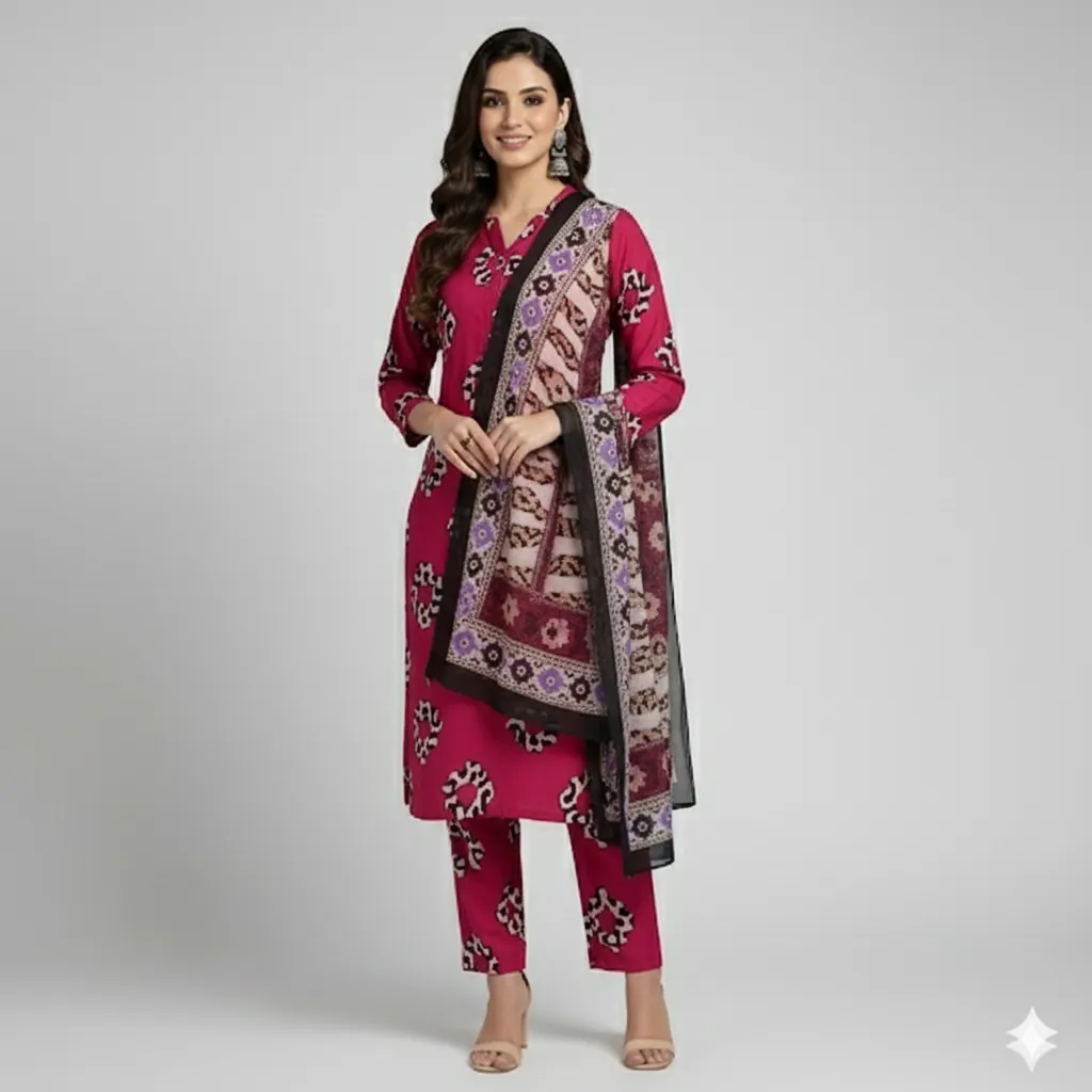 Zeen by Arfat Fabrics 3-Piece Pink & Black Floral Lawn Suit - Patterned Dupatta | Summer Collection. Embrace the lively spirit of summer with the Zeen by Arfat Fabrics Summer Collection. This 3-piece unstitched lawn suit showcases a beautiful digital print with a bold combination of pink and black floral and abstract designs. The world-class quality lawn fabric ensures a comfortable and breathable feel throughout the day. The set includes a coordinating printed lawn voile dupatta with stripes, floral accents, and a touch of animal print, adding a stylish contrast. A solid pink trouser piece completes this vibrant ensemble. Look for the original "Zeen by Arfat Fabrics" stamp as a mark of authenticity and superior quality.
