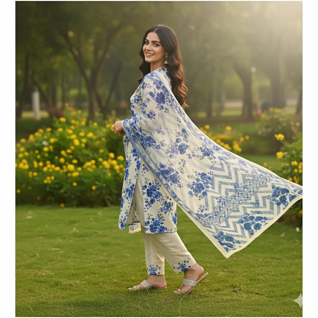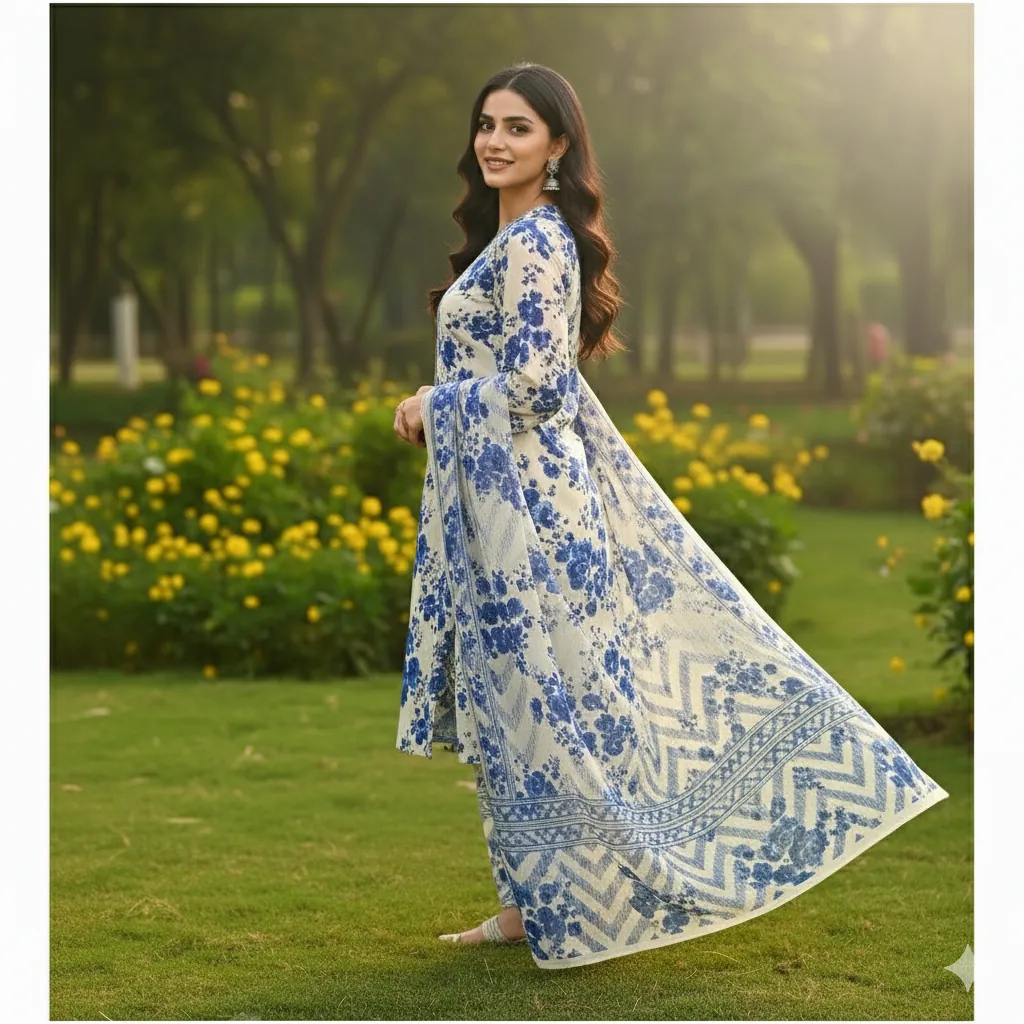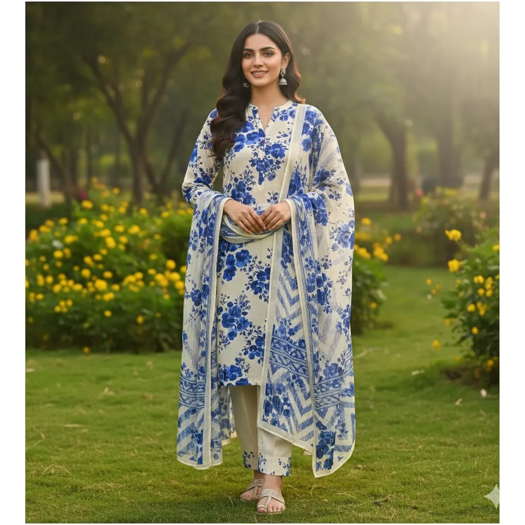 Zeen by Arfat Fabrics – Unstitched 3-Piece Lawn Suit in Beige with Royal Blue Floral Print. Make a bold yet elegant statement with Designed with a soft beige base, the outfit features vibrant royal blue floral prints and stylish zigzag detailing for a modern ethnic touch. The set includes a printed shirt, printed dupatta, and a plain dyed trouser for a complete traditional look that’s perfect for casual wear, tea parties, or summer events.