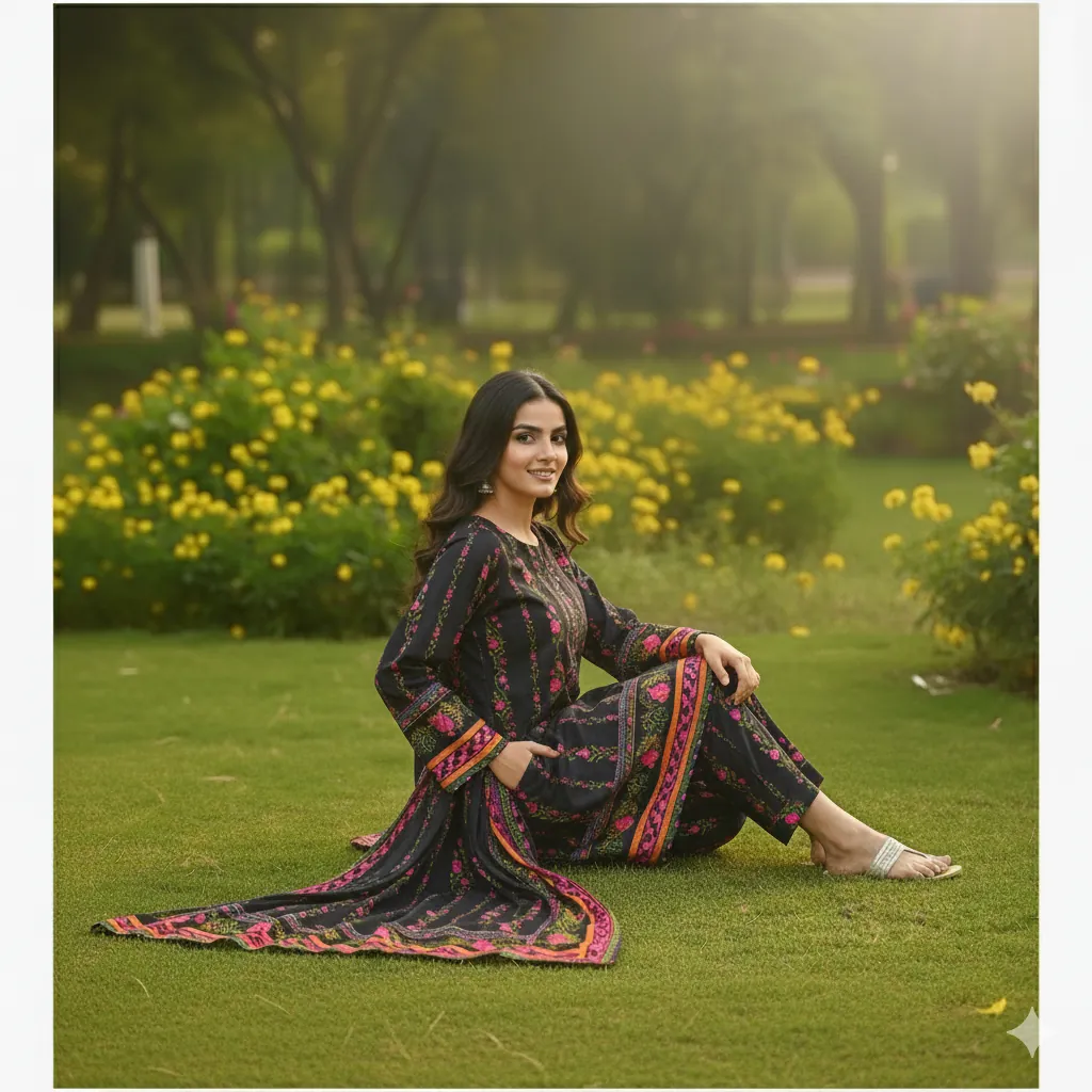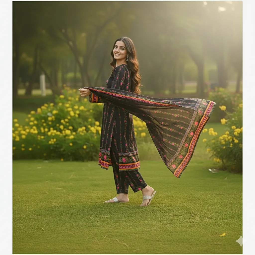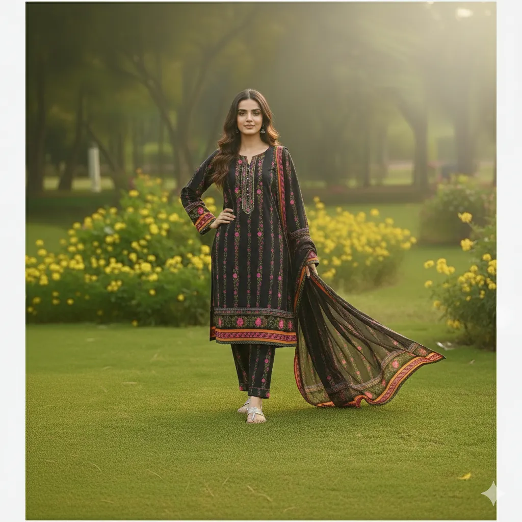 Zeen by Arfat Fabrics – Unstitched 3-Piece Lawn Suit in Black with Pink & Green Floral Embroidery. Elevate your wardrobe with Arfat Fabrics. The suit showcases a solid black fabric adorned with delicate pink and green floral embroidery, creating a perfect balance of boldness and grace. The set comprises a printed shirt, a matching embroidered dupatta, and a plain dyed trouser for a complete, versatile ensemble suitable for both casual and formal occasions.
