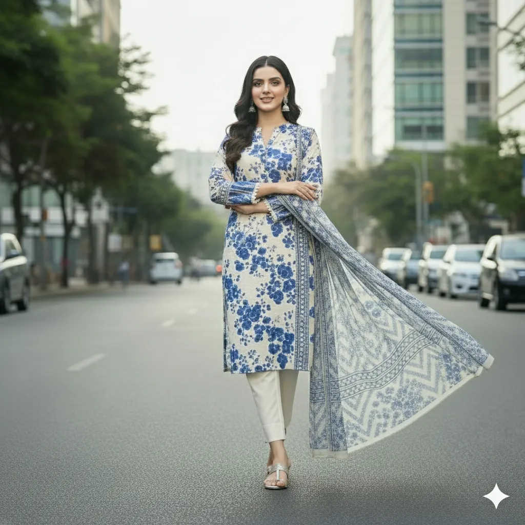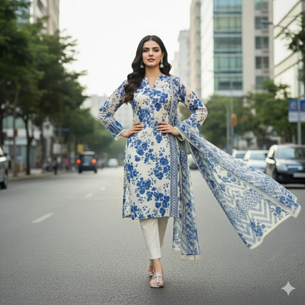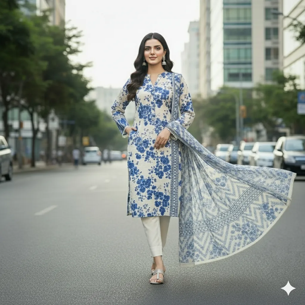 Zeen by Arfat Fabrics – Unstitched 3-Piece Lawn Suit in Cream with Blue Floral & Abstract Prints. Add timeless elegance to your wardrobe with Crafted from soft, breathable fabric, the suit features a cream-colored base adorned with vibrant blue floral and abstract prints, giving it a fresh and classy look. The set includes a printed front & back shirt, a coordinated printed dupatta, and a plain dyed trouser in matching cream tone. Ideal for everyday wear, casual outings, or festive gatherings.