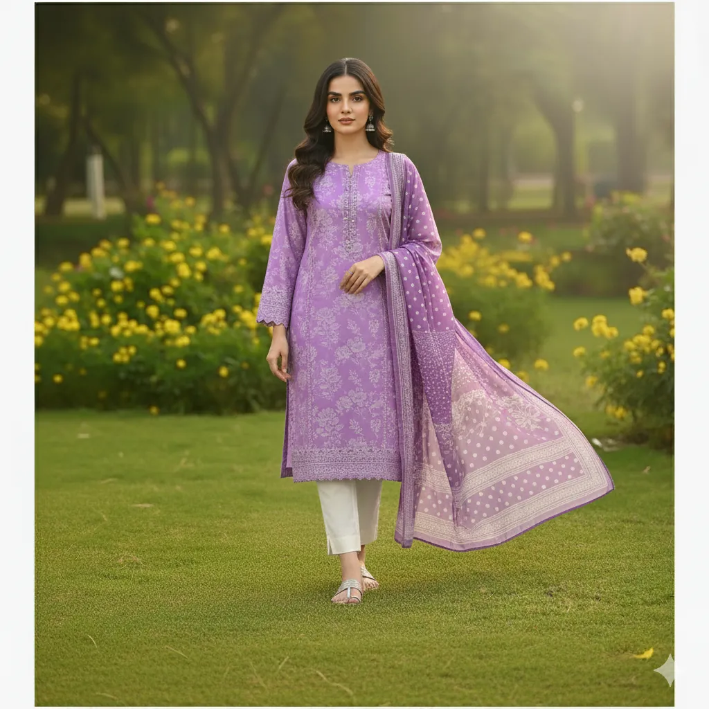 Elevate your wardrobe with this unstitched 3-piece lawn suit from Zeen by Arfat Fabrics. The ensemble showcases a deep maroon base embellished with beige and gold floral patterns, exuding sophistication and charm. The printed shirt and coordinated printed dupatta create a harmonious look, while the plain dyed trouser in matching maroon completes the outfit. Crafted from soft, breathable lawn fabric, this suit ensures comfort without compromising on style, making it perfect for festive gatherings and formal events.