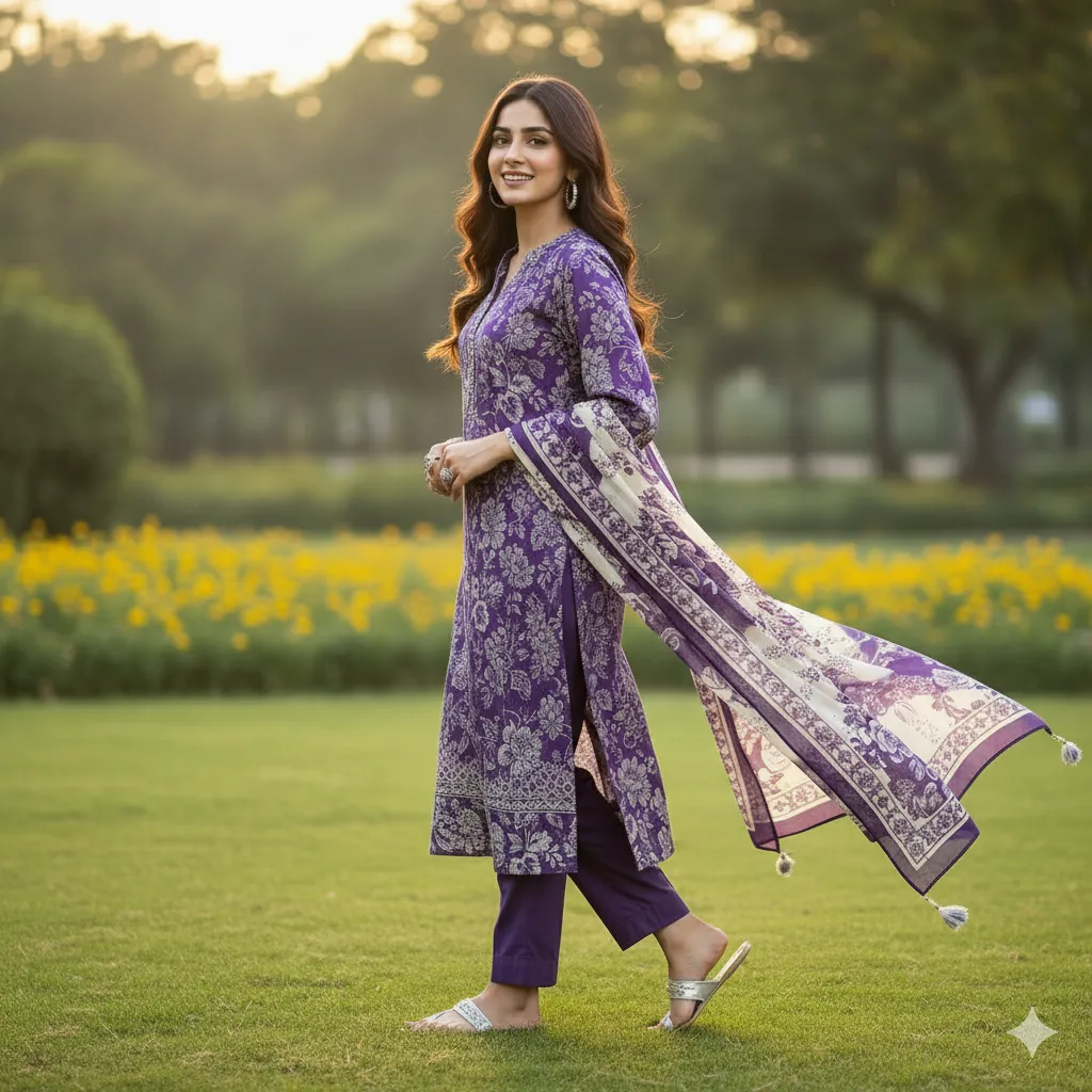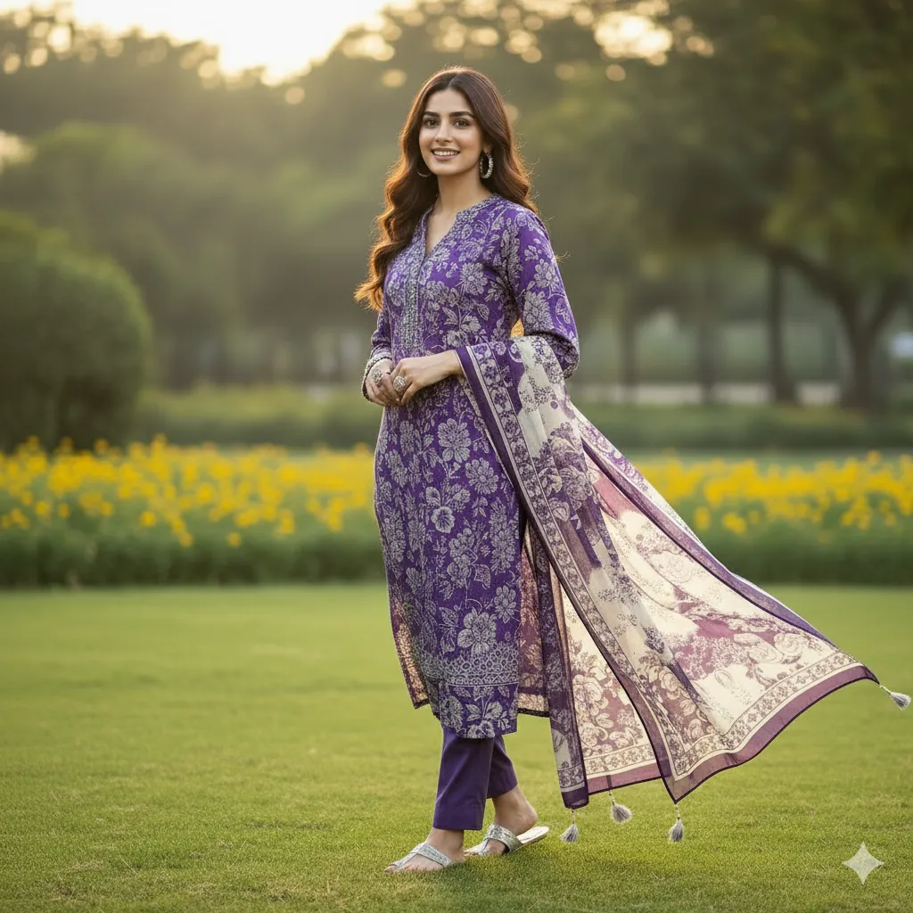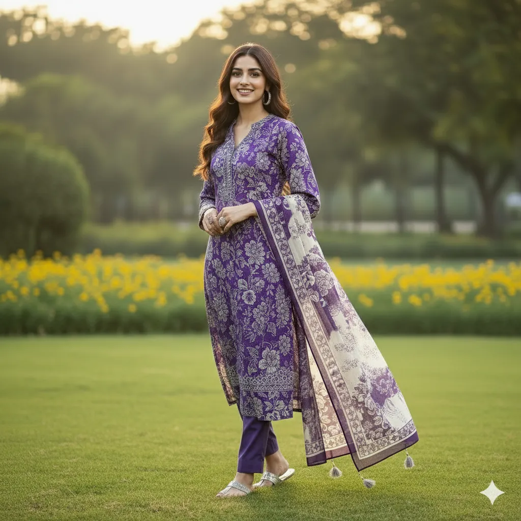 Add timeless grace to your wardrobe with this premium unstitched 3-piece lawn suit from Zeen by Arfat Fabrics. The shirt fabric is styled in a rich royal purple shade and adorned with sophisticated white floral motifs, offering a classy and feminine appeal. The dupatta complements the shirt with matching floral patterns on a lighter base, while the plain dyed trouser adds balance to the complete look.