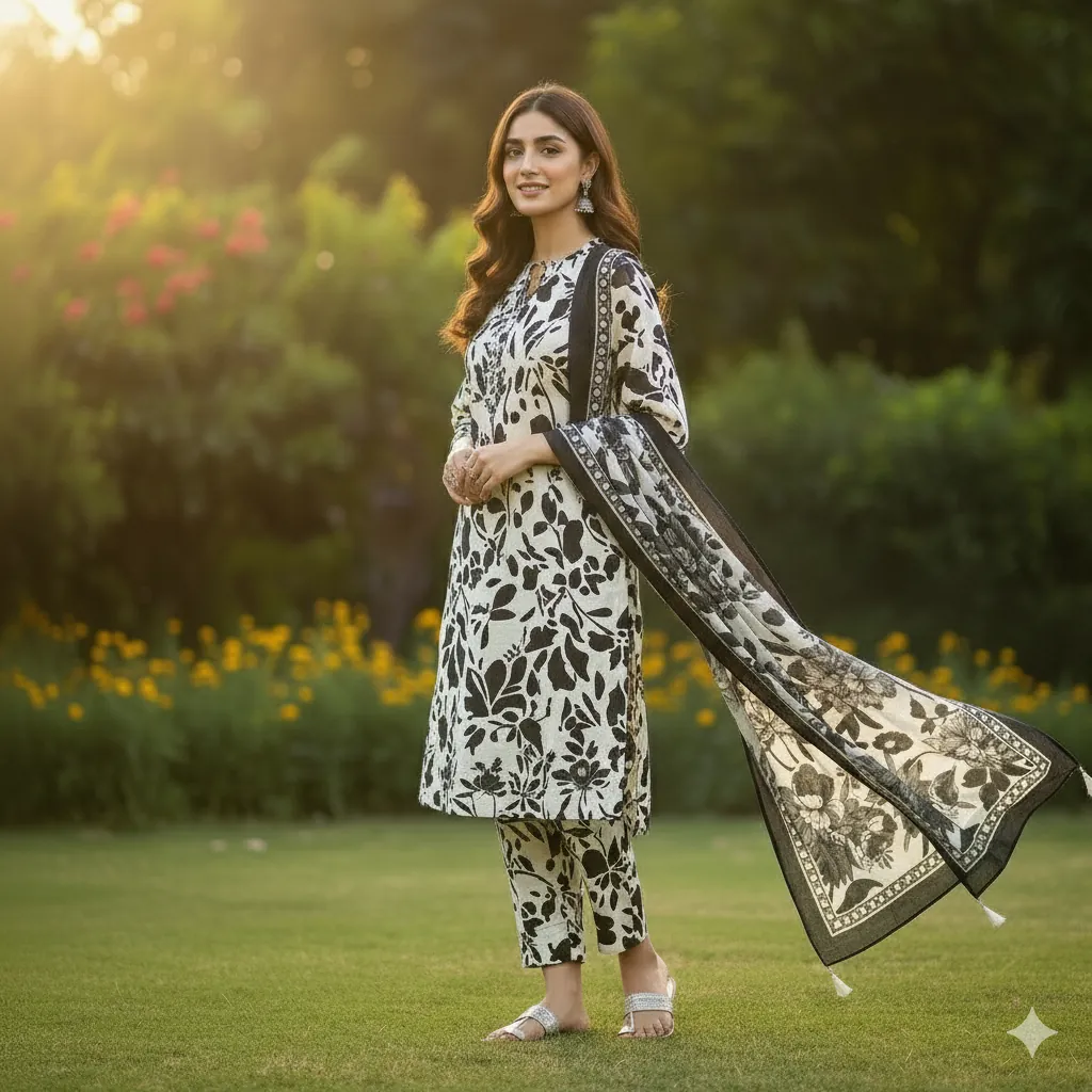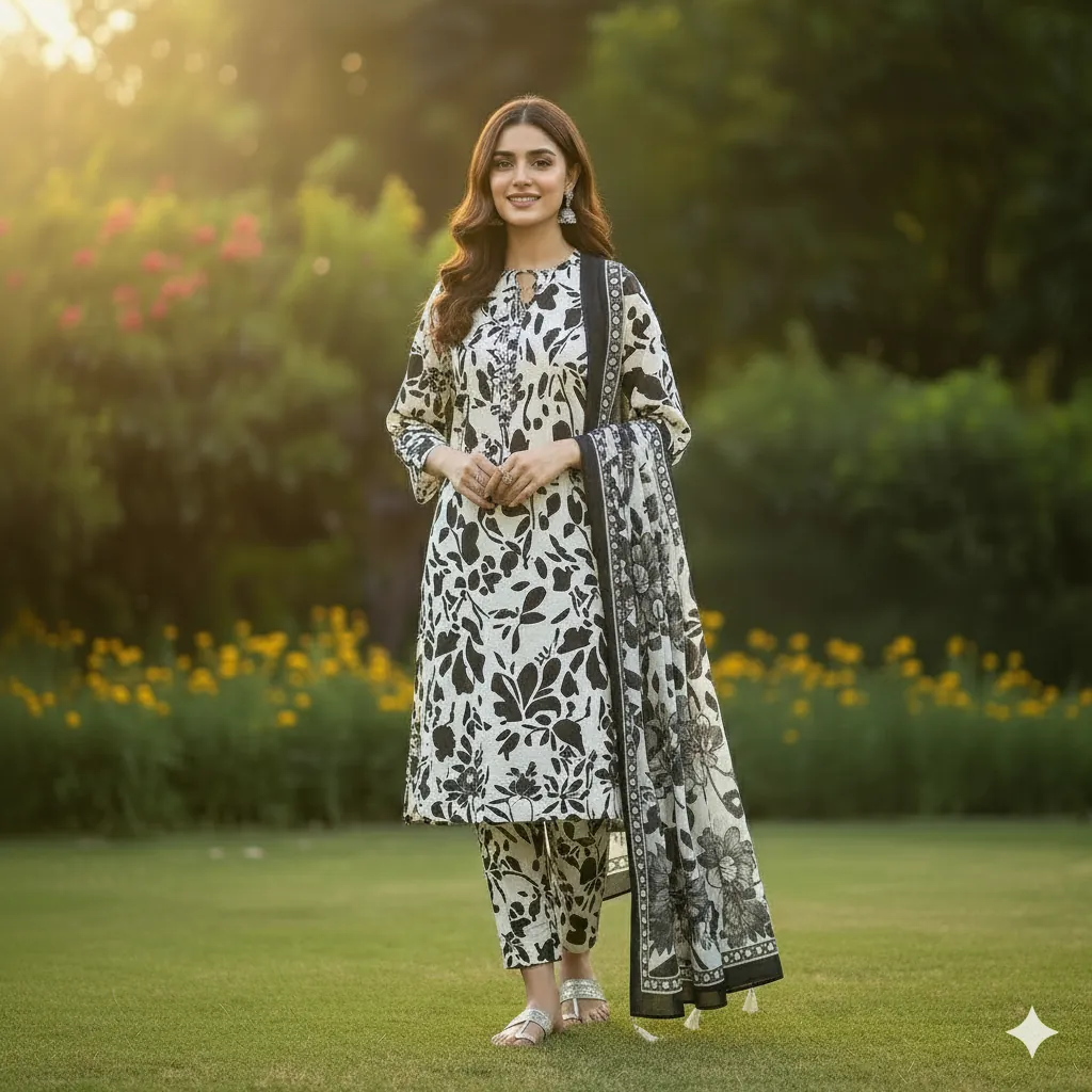 Upgrade your wardrobe with this Zeen by Arfat Fabrics unstitched 3-piece lawn suit, designed for elegance and everyday comfort. The black shirt is enhanced with subtle beige and cream floral prints, giving it a soft yet striking appearance. Paired with a matching printed dupatta and plain dyed black trouser, this suit offers a balanced and polished outfit ideal for casual outings, office wear, or semi-formal events.