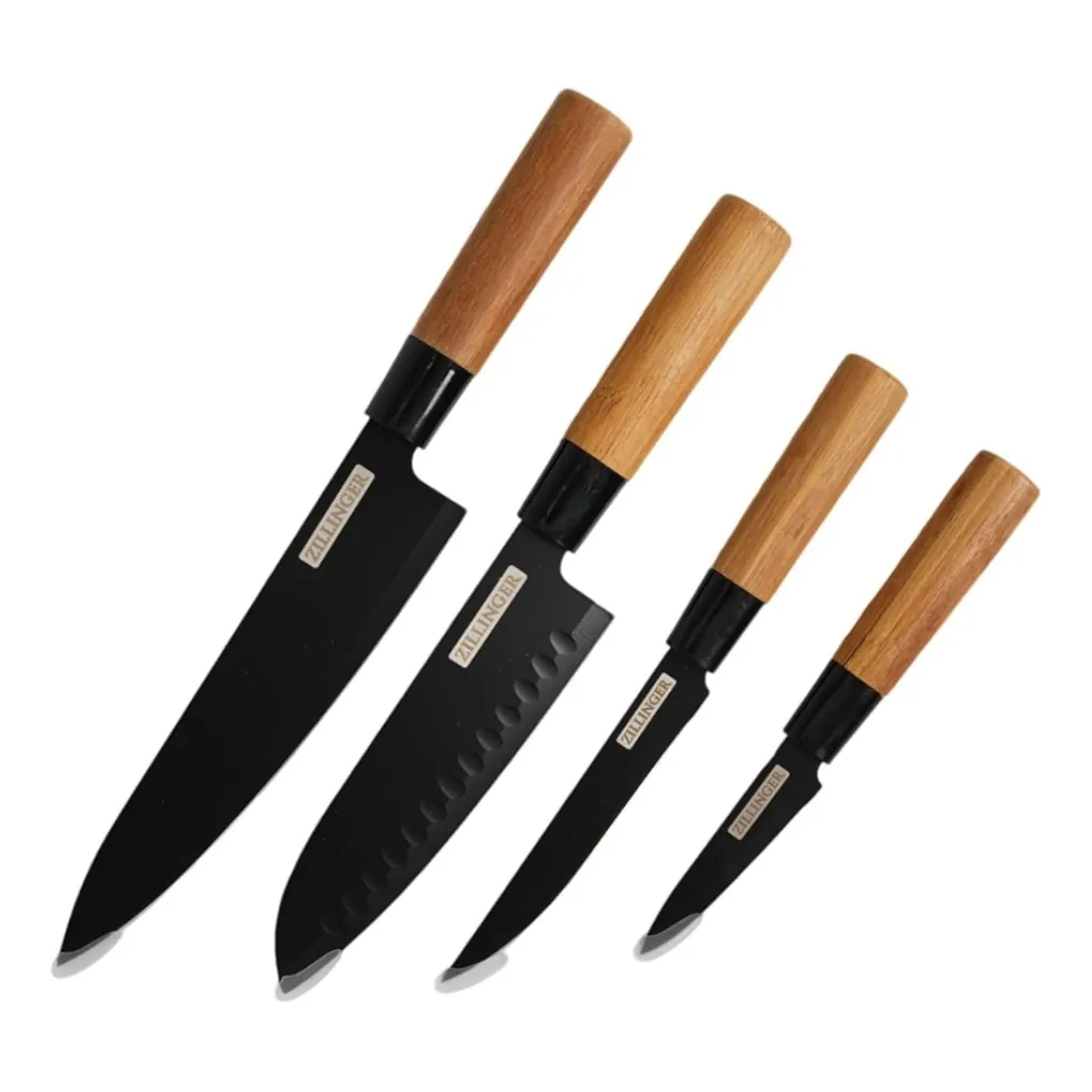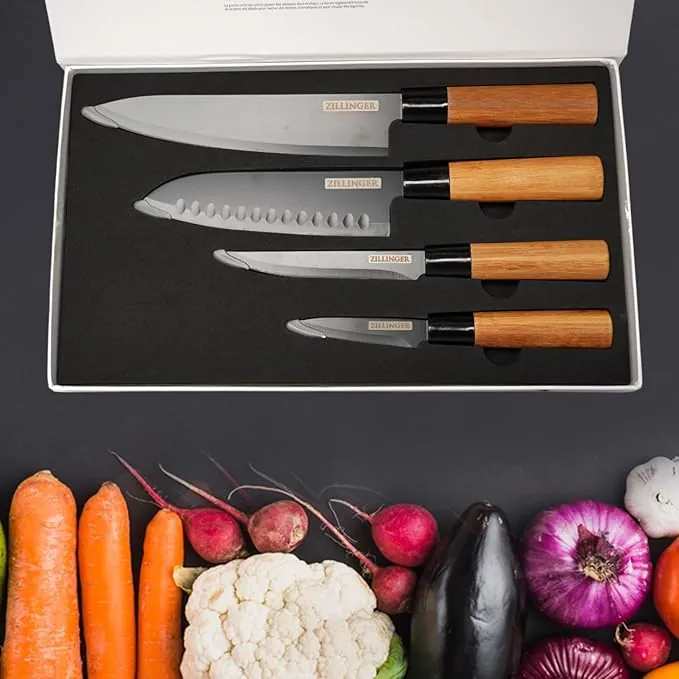 Unleash your inner chef with the ZILLINGER Japanese Style 4-Piece Kitchen Knife Set, a perfect blend of traditional craftsmanship and modern design. This exquisite set includes four essential knives, meticulously crafted to handle all your culinary demands with precision and ease. Each knife boasts a high-carbon stainless steel blade, treated with a non-stick coating (often black, as seen in the image) to prevent food from sticking, making slicing and dicing a seamless experience.